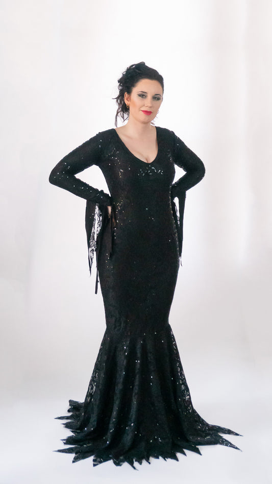 Matte black lace gothic sexy Morticia Addams Inspired Deluxe gown