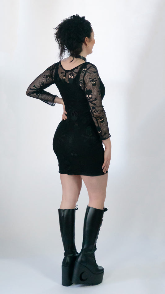 Nightshade Net Long sleeve black skull Fishnet body con mini dress